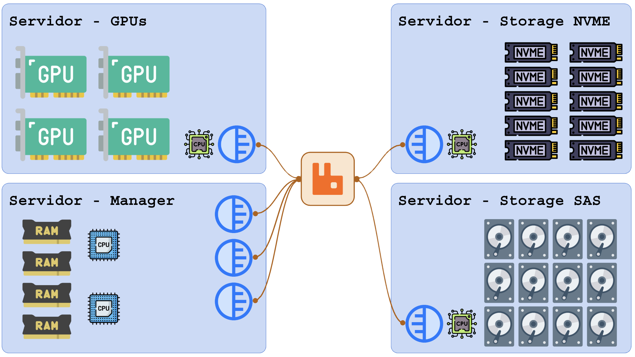 Cada serviço roda em hardware especializado. Servidor de GPUs pode rodar pedidos de inferência de IA e renderização, o servidor de storage NVME cuida de armazenar dados com velocidade, o servidor de storage SAS é focado em armazenar e recuperar dados volumosos que raramente são acessados e o servidor de gerência rodas os principais serviços que só dependem de CPU e RAM. O RabbitMQ pode rodar em serviço dedicado interno, externo ou no próprio servidor de gerência.