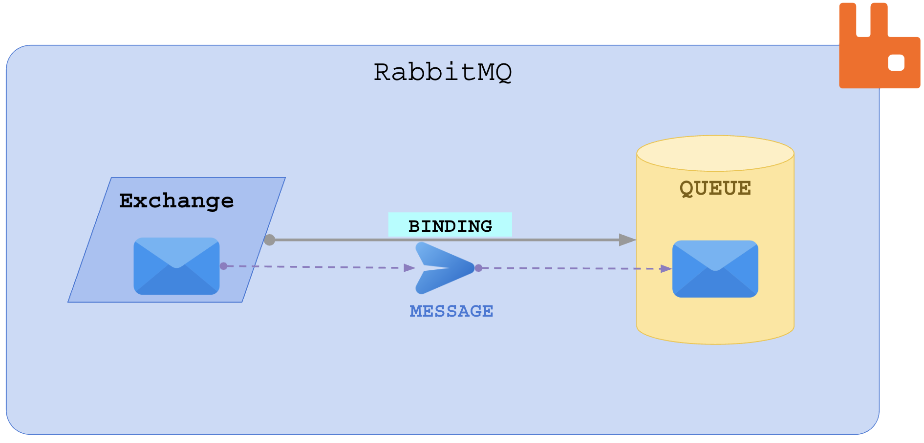 Ao detectar uma nova mensagem na entrada (EXCHANGE), as regras de escuta e distribuição (BINDING) conduzirão a mensagem até a fila de armazenamento (QUEUE).