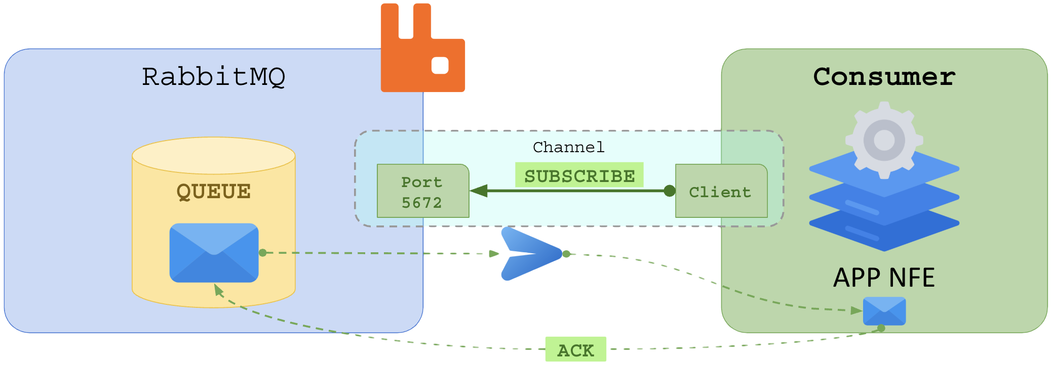 As mensagens se acumulam na fila. O RabbitMQ espera que sistemas se conectem na porta 5672/TCP por meio do comando de inscrição (SUBSCRIBE).