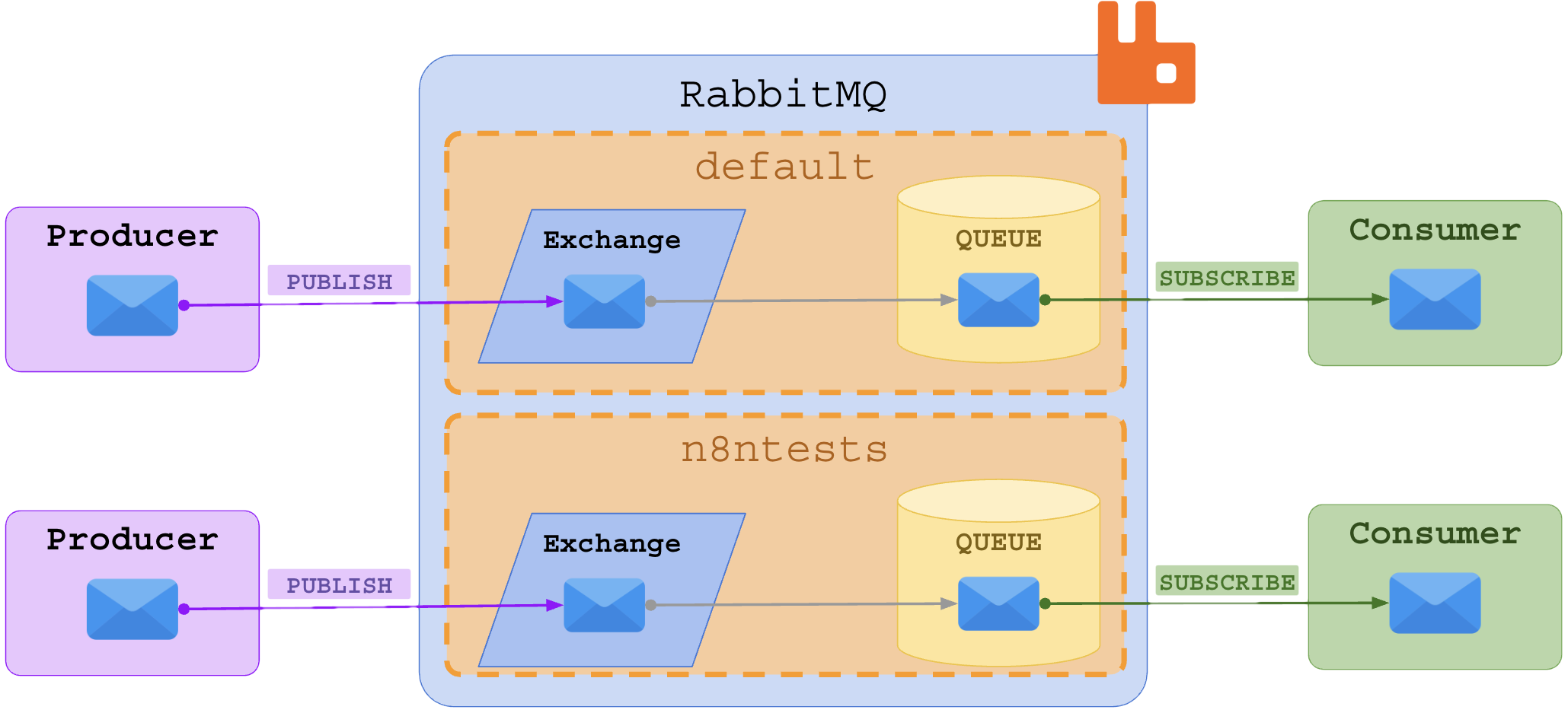 O RabbitMQ possui um conceito de virtualização chamado de VHOST (virtual host) que facilita a organização de diferentes sistemas em uma única instância.