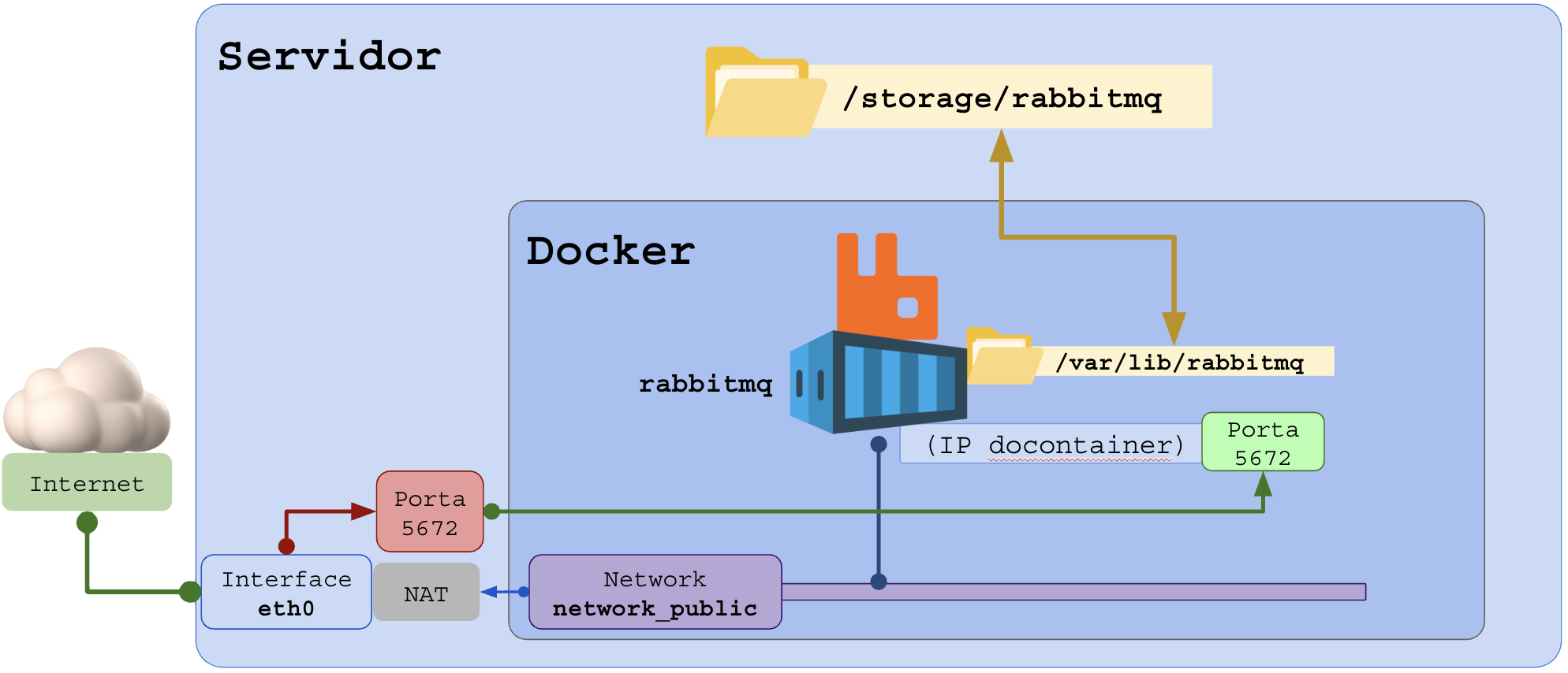 A parte importante do RabbitMQ é você possuir o endereço IP ou DNS (FQDN) do servidor e a porta 5672/TCP redirecionada para o container. Basta essa porta para que os clientes possam se conectar para relações de PUBLISH e SUBSCRIBE.