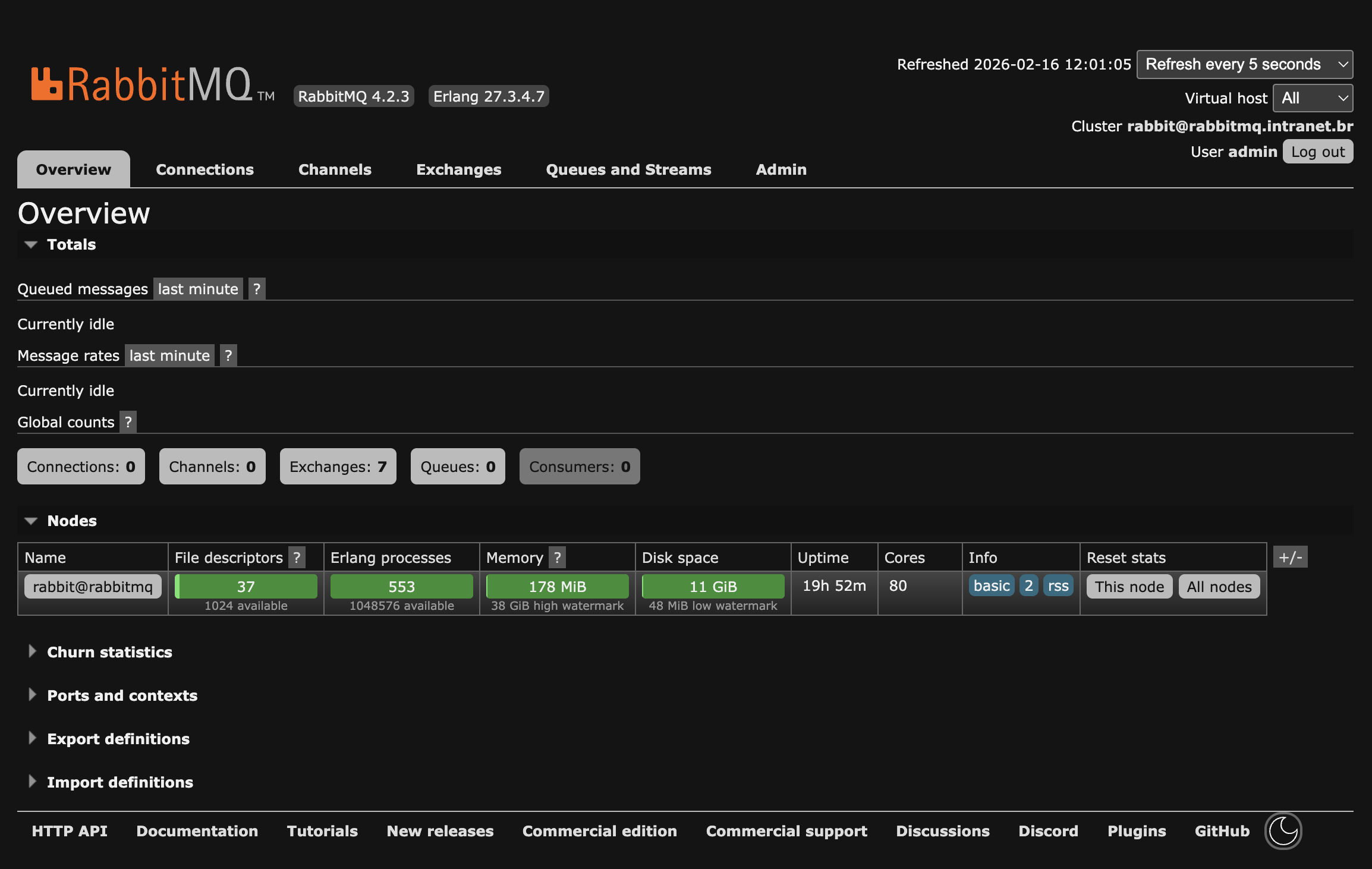Cuidado: as portas do RabbitMQ não possui criptografia TLS/SSL. É necessário usar o Traefik ou algum túnel/VPN para transmitir pela Internet o tráfego de mensageria e autenticação. Risco crítico por transmissão de senha em texto plano.